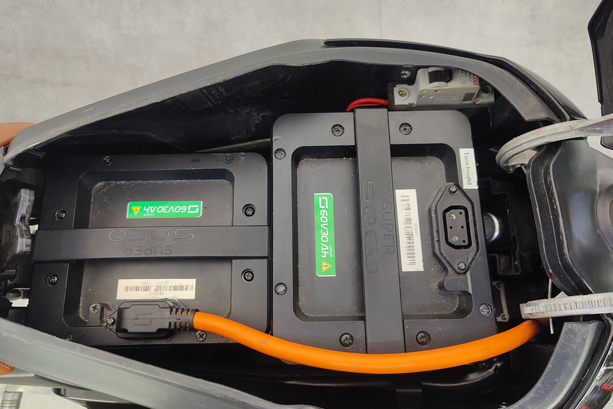 Energy is supplied by dual 60V lithium-ion battery system (24Ah) with up to around 80 miles in range depending on setup and riding conditions. Charging is simple via a standard UK socket, with a full charge typically taking around 3–4 hours per battery.